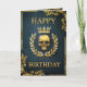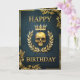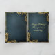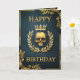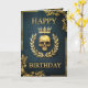 Um cartão de aniversário de couro ciano escuro e luxuoso adorado com alivio de ouro gótico real apresentando um crânio ouro ameaçador flanqueado por uma coroa de louros de folhas de ouro e, finalmente, uma coroa de ouro gloriosa brilhando com luz deslumbrante simbolizando uma antiga linhagem real. Perfeito para um aniversário real e real temático com um toque gótico perfeito para amantes da bruxaria escura e gótica, arcana e horror macabro.