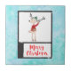 Cadeado cerâmico com uma bela ilustração caprichosa de uma rena de Natal engraçada num suéter feio, perfeito para a temporada de férias. Ele está de pé em duas pernas e balançando olá. Ele tem grandes galhadas e um boné de inverno verde e bonito. O texto abaixo diz Feliz Natal em letra manuscrita, em cor vermelha festiva. O fundo é um design de cor d'água com aspecto gelado azul.