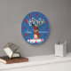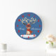 Relógio gráfico divertido com uma ilustração de uma rena com o joelho vermelho na neve. Personalize com sua saudação sazonal. Este exemplo diz Feliz Natal. Desenvolvido exclusivamente pela Sarah Trett.