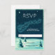 Um cartão RSVP da festa de Natal com uma ilustração antiga de Papais noeis no trenó sendo puxados por suas renas. Pequenas estrelas no céu noturno. A neve cobriu pinheiros no chão. Sensação retrô de safena.