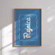 Poster de feriado minimalista com "Rejoice" em letras brancas em um fundo azul suave, enquadrado com um arco e uma borda ondulada. Perfeito para decoração moderna do muro de Natal ou celebrações sazonais.