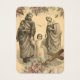 This is a beautiful lithograph sepia toned print of the Holy Family , the Child Jesus, Blessed Virgin Mary, and St. Joseph. The Holy Spirit appears above in the form of a dove (Circa 1800's) with a floral and cross overlay.