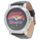 Este design capta uma vibrante e retrorinspirada cena do pôr do sol. Um sol estilizado, com um gradiente marcante, de roxo profundo a laranja nojento, fica atrás de uma cordilheira detalhada. As montanhas são fundidas em azuis profundos e pretos, com uma linha de pinheiros escuros em sua base. O texto "Busca" e "Sonhos" enquadra a imagem em uma fonte ousada e retrógrada com um esquema de cor rosa e azul brilhante, evocando um senso de aventura e otimismo. É uma mistura perfeita de beleza natural e uma estética retrô, ideal para aqueles que amam viagem, natureza, e estilos de arte antigos.