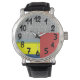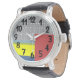 Este relógio masculino tem um design de linhas pretas quebradas que correm verticalmente em retângulos de azul claro, verde, azul, amarelo e vermelho. Quer cores diferentes? Me mande mensagem.