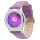 A face do relógio está iluminada com a flor silvestre da Glória da Morning, rosa-púrpura, contra uma cerca de madeira. As vibrantes, delicadas, pequenas beleza fazem disto um relógio especial. A cor deles também elogia a banda roxa! Mas você pode comprar o relógio com qualquer banda que você preferir. Obrigados para comprar conosco em GloriousGloriesGifts!