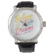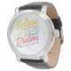 Uma design divertida e encorajadora que mostra o texto "Acredite em seus sonhos" em uma letra colorida e escrita à mão, representando a energia e o impulso necessários para atingir seus objetivos.