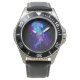 Água-viva grande, azul, desenhada artisticamente, brilhante, brilhante, com longos tentáculos sobre fundo preto com bioluminescência roxa. Água-viva luminosa.