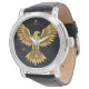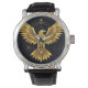 Uma imagem impressionante de uma águia geométrica, intricadamente projetada com asas de propagação, posicionada contra um fundo abstrato-escuro com padrões místicos. Ideal para temas de força, poder e liberdade.