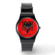 The flag of Albania depicts a silhouetted black double-headed eagle in the center of a red background