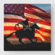Um belo relógio com um vaqueiro com uma bandeira americana no fundo.