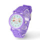 Um relógio com uma ilustração fofinha, com um coelho, um urso e um veado, todos vestidos com roupas festivas. Adorável e caprichoso.