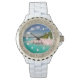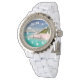 A watch with a beautiful photograph. A scenic tropical beach with aquamarine water and a white sandy beach with a lush forest in the back. A solitary umbrella available for those who love seclusion.