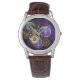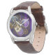Aranha steampunk feita de ouro e aço com relógios antigos decorados com engrenagens douradas em fundo roxo, listrado e texturizado com lentes e engrenagens de latão. Estilo steampunk.