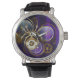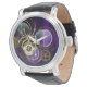 Aranha-do-galo feita de ouro e aço com relógios antigos decorados com engrenagens de ouro sobre fundo roxo, listrado, texturizado com lentes e engrenagens de latão. Estilo Steampunk.