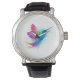 Bela, iridescente, exótica beija-flor voadora sobre fundo branco, pintada com pintura multicolorido, aquarela. Cotovelo-cotovelo.