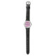 Este relógio tem um design de arte de formas de diamante feitas de ângulos sobrepostos em linhas pretas coloridas em tons roxos e cor-de-rosa com linhas pretas diagonais fazeres que a design se parece com argyle