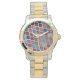 Este relógio tem um design de arte de quadrados feitos de ângulos sobrepostos em tons retrorados de azul e rosa.
