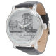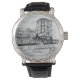 : Coluna Negra Clássica Masculina Vigia o clássico relógio de couro Shambles mostra o antigo edifício no seu antigo estilo medieval. Este relógio será um fazer acessório na moda, ele é o perfeito visual em moda para sua roupa. Projetado por Creativelea.