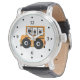 Relógio de pulso do professor de na moda ou motorista de ônibus escolar com gráficos bonitos de joias em um ônibus escolar de bolinhas amarelo e branco, em um fundo branco. Números negros e pontos representam as horas. Personalize para adicionar qualquer texto que você quiser.
