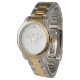Mostrado em dois tons de aço inoxidável Dourado e incolor Prateado, este relógio tem uma face branca com marcas de tempo de Cinza Prateada, coroa de trabalho de rolagem de rico colorido de Prata, seus Três monogramas personalizados e uma linha de texto personalizada sob seu título, data especial, etc. Tem a segunda mão e no estilo da pulseira. Este relógio é unisexo. Personalizar este item.