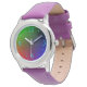Um relógio colorido com o rosto multicolorido e os números para combinar.Combine isso com tiras roxas, e você tem um presente de excelente para meninas. Personalize a cor da precinta para os rapazes.