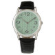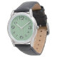 Este relógio masculino tem um design de deco de arte de meio círculo azul e roxo se conectam com linhas em um campo de verde-claro.