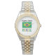 Design, num relógio feminino, exibe a bandeira brasileira, com o nome BRASIL estirado nas mesmas cores da bandeira. Por cima, um lugar para um nome personalizar para você mesmo ou personalizar para um presente.