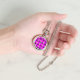 Este relógio feminino tem um design Bauhaus de triângulos sobrepostos em roxo, magenta e rosa.