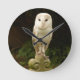 Foto de um belo Coruja do Celeiro empoleirada numa estátua de pedra mostrando detalhes de seu rosto e detalhe de pena pelo artista inglês Dave Fletcher