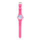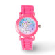 Um relógio com a imagem de um unicórnio com grandes olhos azuis, asas cor-de-rosa e um arco-íris mano e cauda. Kawaii fofo.