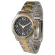 Este relógio masculino tem um design de deco de arte de meio círculo branco se conecta com linhas em um campo de preto.