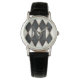 This elegant custom watch has a monogram on a background of a black and antique white Harlequin pattern. A trompe l'oeil effect makes the monogram appear 3-dimensional.