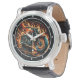 This close-up image showcases a bold watch face with a dynamic illustration of a custom motorcycle. The bike is enveloped in vibrant orange and red flames, creating a sense of speed and intensity against a dark background. Silver numbers and watch hands are clearly visible, making it a striking accessory for motorcycle enthusiasts who appreciate high-energy designs.