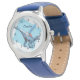 Qualquer menino adoraria este relógio que apresenta um dinossauro azul! O dinossauro fantástico é colocado na parte inferior do relógio sobre um fundo azul-claro de borda irregular. Seu nome está escrito em azul escuro no centro superior, e os números azuis correspondentes ao redor da borda tornam o relógio fácil de ler.