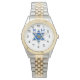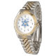 Tanto os pulsos masculinos como femininos em todo o mundo deram os seus "Thumbs Up" a este maravilhoso design! A face branca, o bezel claro e a banda de dois tons é um olhar de tendências que é tornado ainda mais único e especial pelos lapis azuis azuis inspirados por Magen David centrado no rosto, marcadores de horas numéricas pretas que imitam o olhar do hebraico, e campos de texto personalizados para as iniciais do usuário.