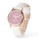personalized watch, pink dial, gold watch, white leather strap, feminine gift, elegant wristwatch, monogram watch, luxury accessory, custom initials, timeless fashion