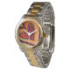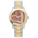 Um pequeno coração roxo é fechado por um coração vermelho que está dentro dos corações laranja. Os corações são esboçados em verde, roxo e vermelho. O fundo de aquarela é um amarelo macio com pontos de confete coloridos. Uma camada clara de ouro e brilho vermelho traça as bordas do coração. Detalhe da pintura do trabalho de arte "Feliz" da Palavra Inspiracional. Faça com que o coração de amor personalizado assista designs com suas mensagens pessoais e/ou fotos. Use o botão "personalizar". Os corações da arte fazem excelente personalizado pulso assistindo presentes!