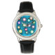 Este relógio tem um design geométrico de círculos de diferentes cores com linhas a sair num campo de azul.