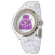 Um design adorável com um bolo de casamento roxo de três camadas com sotaques florais.