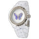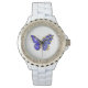 Borboleta de flores cinza, azul, safira, espumante com asa decorada com flores preciosos azuis com folhas de ouro sobre fundo branco.