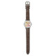 Este relógio feminino tem um adorável buldogue bebê sentado e pensando em brincar no quintal em vez de ter que sentar e comer sua refeição. O retrato é um pouco do lado dos desenhos animados e há algum efeito vintage ou envelhecimento para obter essa aparência junto com o relógio é para aquela mulher que tem um forte senso de lealdade, como todos sabem que os buldogues são muito leais.