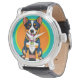 Ilustração admirável ao estilo cartoon de um cão com olhos brilhantes, vestindo uma coleira e uma corrente, colocada contra um fundo circular colorido.