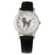 A ilustração original do desenho animado de Destei de um cão da raça Toy Poodle, de cor castanha-casaco. Há também uma área de texto personalizável para um nome. A face do relógio é feita de números pretos.