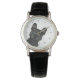 A ilustração original de um desenho animado de um cachorro francês Bulldog / cabeça de um cão francês de raça francesa, de cor preta, que está ligeiramente inclinada. A face do relógio é feita de linhas pretas mínimas, mas algumas delas estão escondidas atrás da imagem do cão.