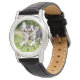 Dois filhotes felizes de Boston Terrier, negros com marcas brancas, correndo lado a lado, carregando pau e se divertindo muito. A raça de Boston Terrier também chamou Boston Bulls ou "American Gentmens". Uma design de fotografia de um animal engraçada por Katho Menden, este relógio é um presente para todos os amantes de cães, todos os amigos que amam cachorros e animais de estimação serão felizes com este presente.