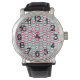 Este relógio masculino tem um design moderno do século médio de ovais de cor de beterraba conectados a cadeias com círculos concêntricos turquesas feitos de anéis circulares dentro. Mesma design, cores diferentes? Me mande mensagem.