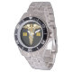 O caduceus exclusivo em marfim, periwinkle, sábio e ouro num estilo inspirado pelo movimento Artes e Artesanatos é balanceado por 2 campos de texto personalizados para suas iniciais às 9h00 e 3h00, todos colocados em uma face preta sólida. Junto com esta elegante banda de aço inoxidável e tampa frontal preta ajustável, é perfeito para o médico, enfermeiro ou outro profissional médico na sua vida!