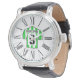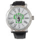 Assistentes de fãs de futebol. Design com camisa verde e branca. Adicione o nome e o número da sua escolha. O rosto do relógio tem números romanos.