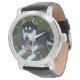 Fotografia do filhote Siberiano Husky na Vintage Black Leather Strap Watch. Você pode mudar para qualquer outro relógio de pulso para homens, mulheres e crianças com esta imagem - preto e branco bonitinho com lindos olhos azuis sentados na grama e assistindo hetero. Presente de excelente para #FathersDay. Adicione seu texto.