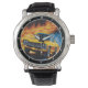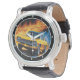 Este relógio vibrante apresenta um carro clássico de músculo amarelo rodeado por chamas laranja dinâmicas. As cores intensas e as imagens poderosas criam um design empolgante e ousado. Ideal para entusiastas de carros e colecionadores, este relógio único faz uma declaração impressionante em qualquer pulso.